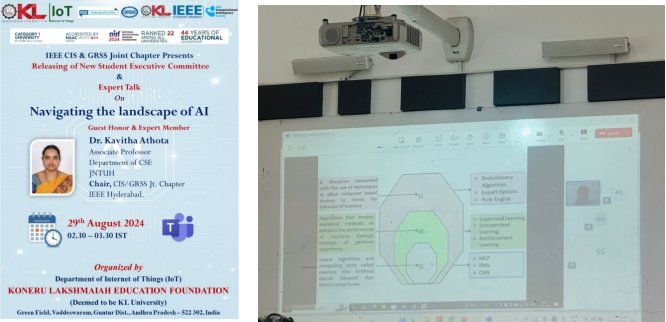 The IEEE Computational Intelligence Society, SBC organized an online guest lecture titled “Navigating the Landscape of AI†on 29th August 2024. The session featured insights from the JNTUH Chair, CIS/GRESS Joint Chapter, highlighting emerging trends and applications in Artificial Intelligence. The expert speaker provided valuable perspectives on current research directions and industrial advancements in AI.