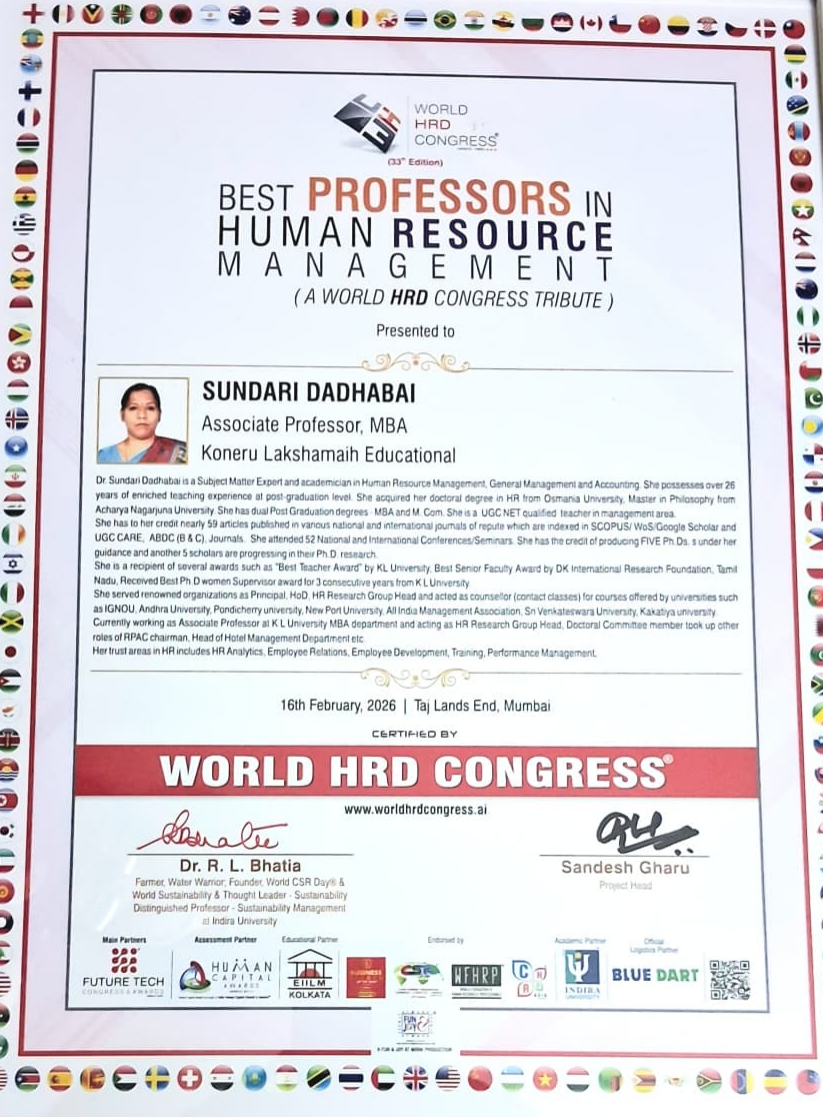 Dr Sundari Dadhabai received the Best Professor Award in Human Resource Management (A World HRD Congress Tribute) on 16th February 2026.